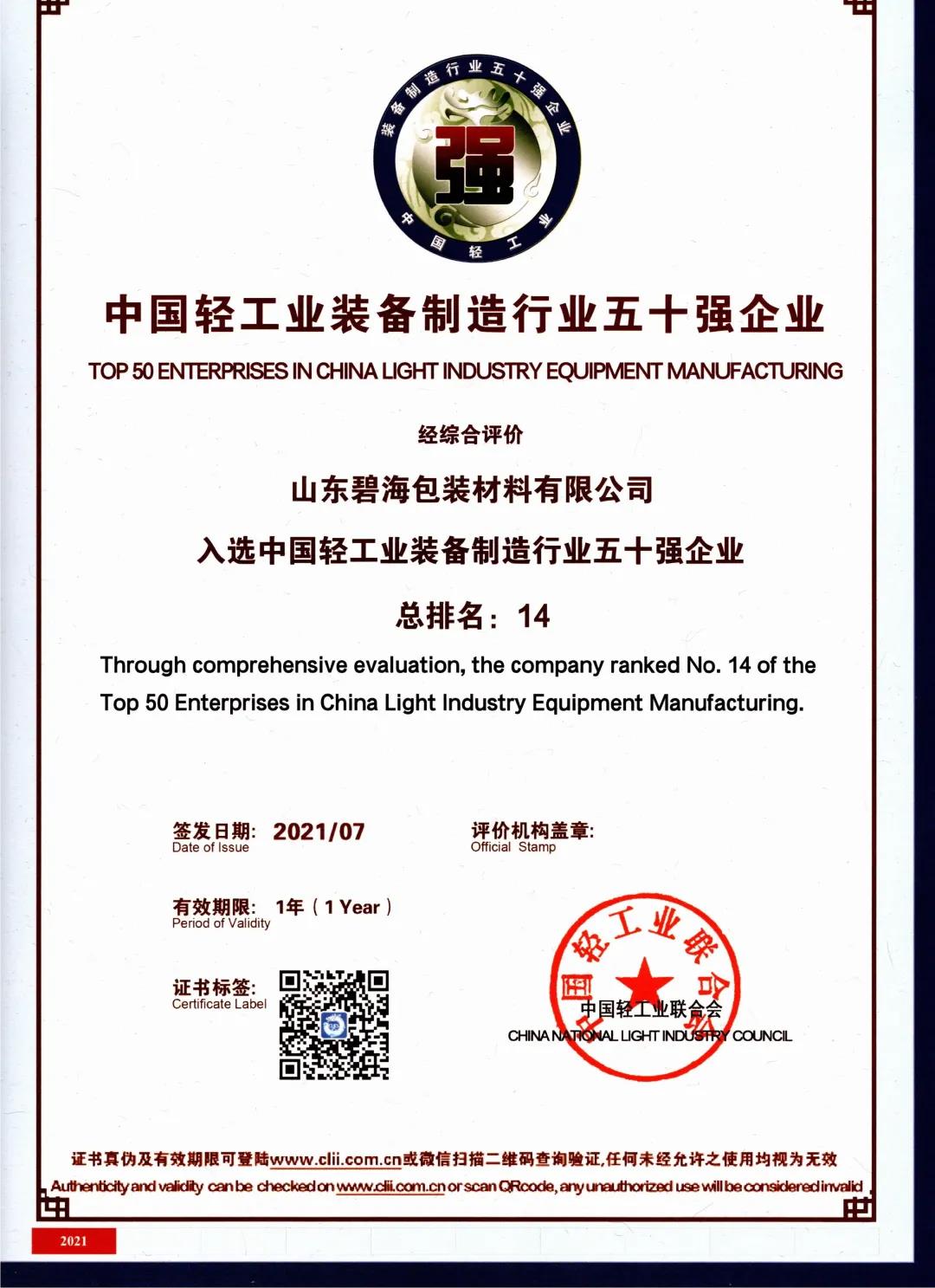 2021年7月20日,在北京召開的“奮進‘十四五’領航新消費”中國輕工業百強企業高峰論壇上,碧海公司入選中國輕工業裝備制造行業五十強企業(排名14)、中國液態食品機械行業十強企業(排名4),這是對我公司綜合實力、創新成就的高度肯定和認可。